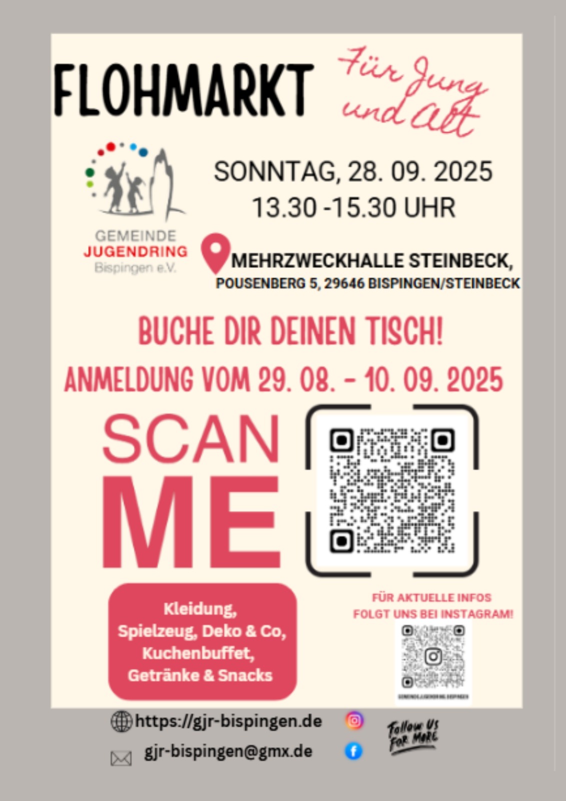 Besuche uns und stöbere in der gemütlichen Atmosphäre der Mehrzweckhalle Steinbeck. Es gibt immer etwas Neues zu entdecken! An beiden Tagen bieten wir Speisen und Getränke zum kleinen Preis an, am Sonntag sogar ein reichhaltiges Kuchen- und Tortenbuffet.